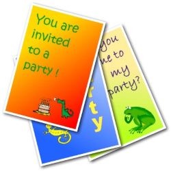 Animals galore. Frogs, dragons and fish decorate these unique animal invites. Bright and fun animal designs.
